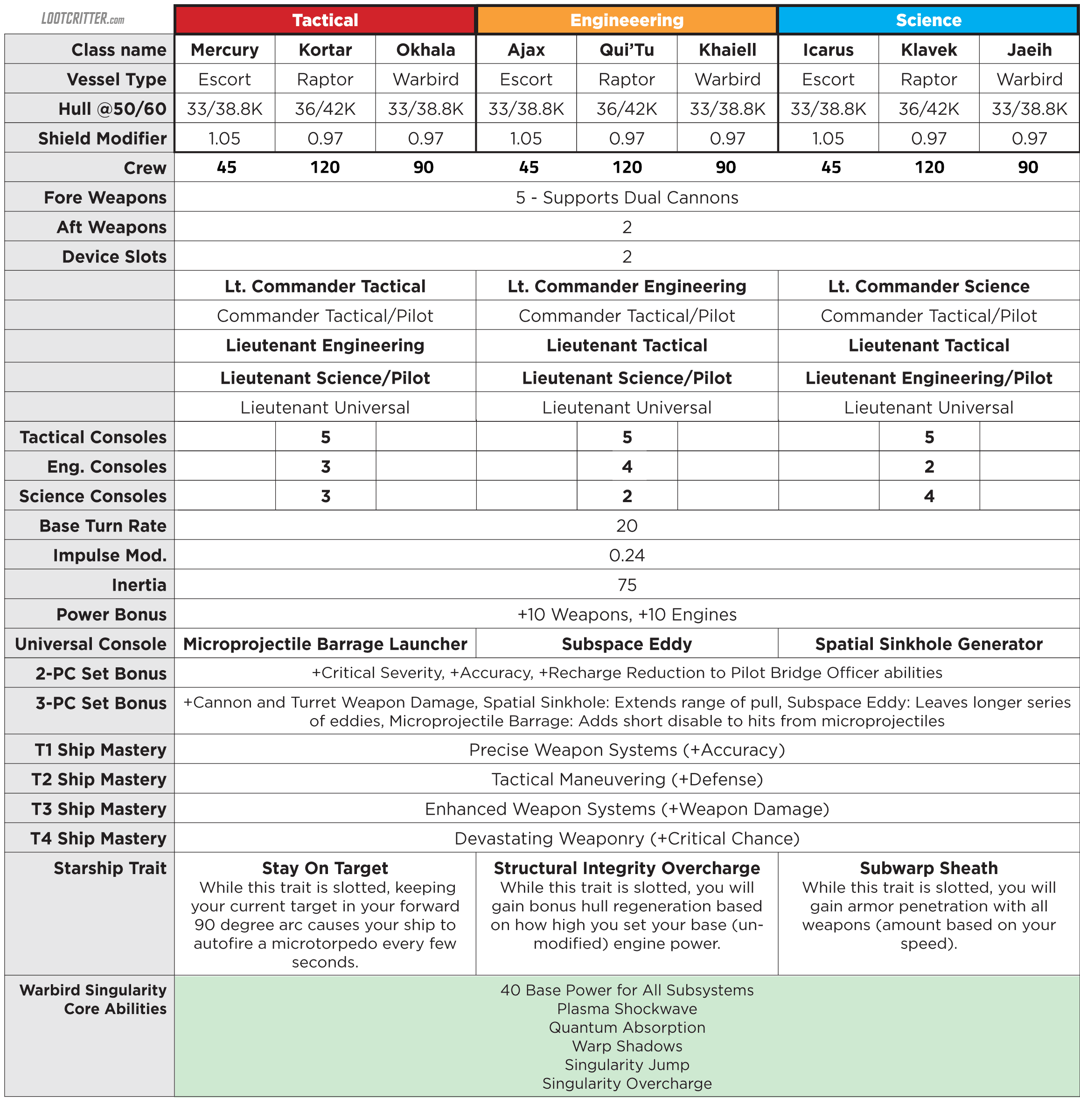 Earlier today LaughingTrendy posted the Ship stats for the Federation, KDF and Romulan Pilot Ship stats.  Comparing them to the most recent T6 Escort/Warbirds, and Raptors these new ships have better hull, shields, turn rate and impulse modifiers.