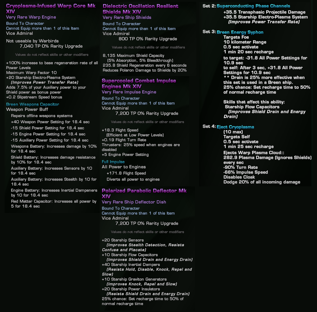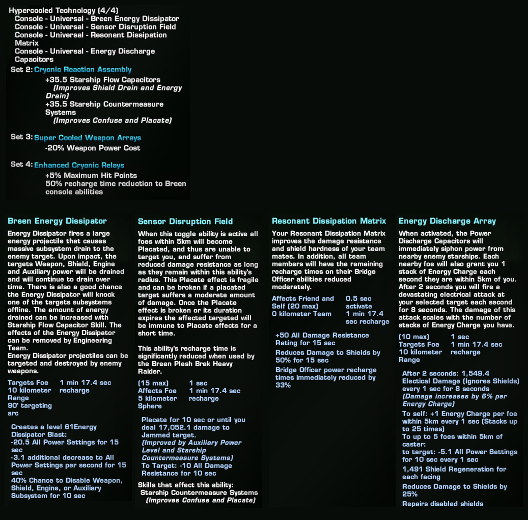 Keeping with the Breen aesthetic, I used the full Breen Absolute Zero set. This set is available for free in-game by completing the Breen episode arc. While not on par with more recent Reputation or even Fleet Gear, it’s still a viable set in the post-DR meta.