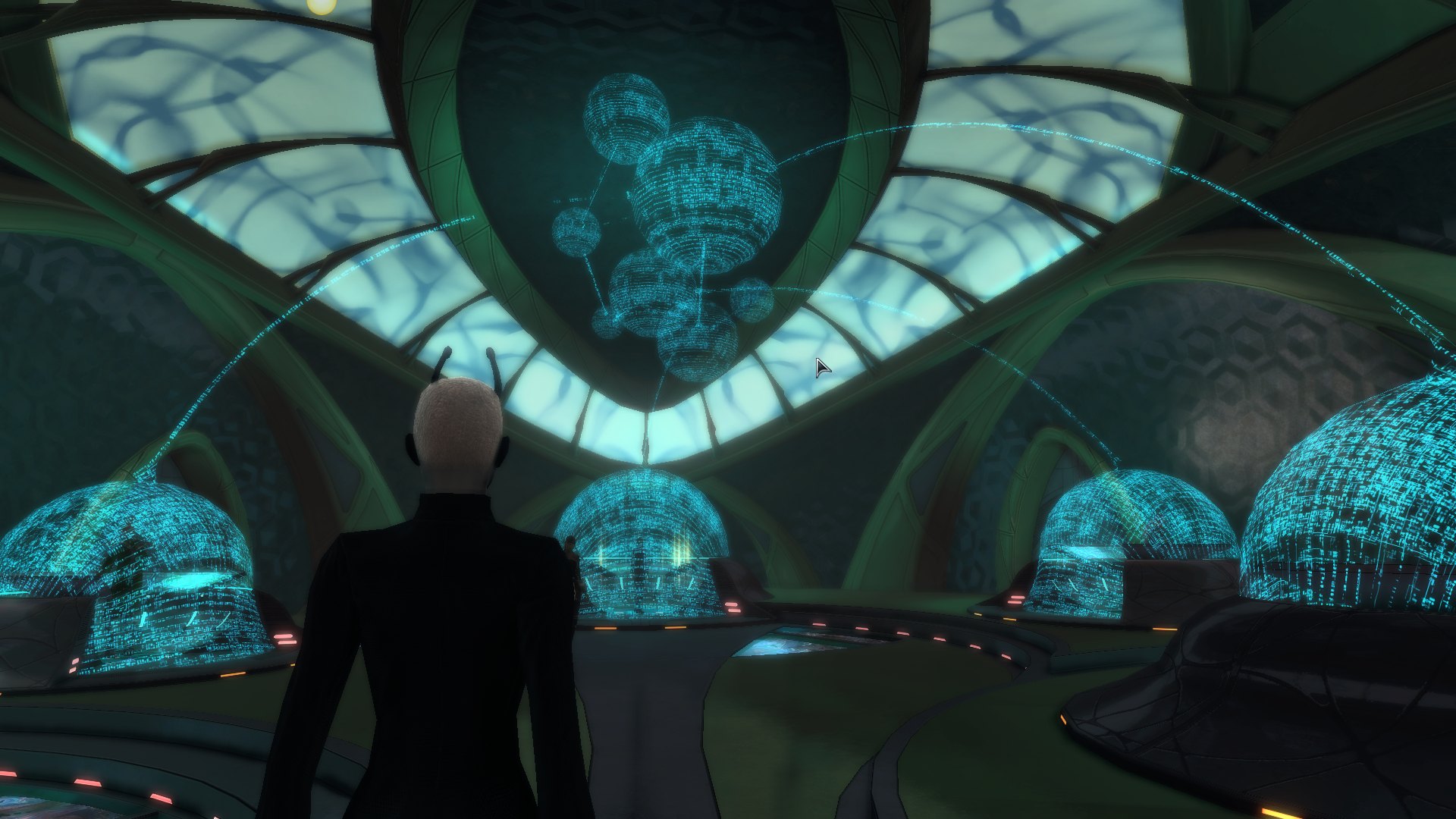 Prior to release there was a fair amount of discussion that the bridge was going to be something generic. I was pleasantly surprised that not only does it have a unique bridge, it’s something that’s alien and yet functional. Four command stations are enveloped by data-spheres, and from inside you can access the ships additional services. It carries through with an organic design which matches the exterior.