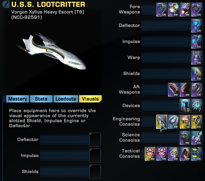 The Hybrid Intel/Universal Lt.Commander seat allows for a lot of flexibility in your design. As I’ve only had the ship a few days, I stuck with a more traditional cannon mixed build I’ve used on other escorts in the past. For this build – I went full tetryon. After a few runs I was fairly happy with the results, but at the urging of my team mates I tried a dual beam build with mixed results. The performance wasn’t an issue, but I will have to admit cannons are far more fun to shoot with a ship this small and agile.
