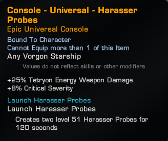 At first glance the Harasser Probes didn’t really spark my interest. Instead of a hanger bay we get a universal console that deploys two level 51 Harasser Probes, potentially lasting 2 minutes. In theory this sounded terrible – two destructible probes that take two minutes to redeploy. The console provides a 25% bonus to Tetryon energy weapons and a bonus CrtD of +8%.