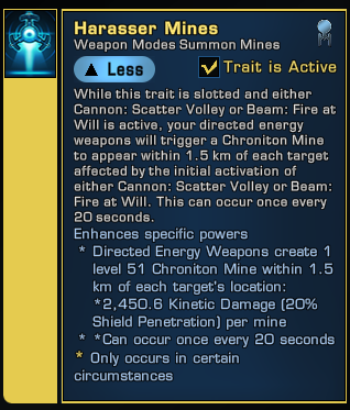 - Harasser Mines drops a level 51 Chroniton mine 1.5 KM from your target. Can occur every 20 seconds, with each mine doing 2.5K damage with 20% shield penetration.